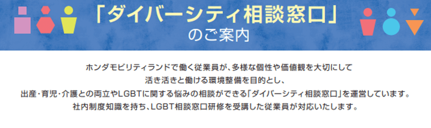 ホンダモビリティランドは、ホンダグループ共通の基本理念である「人間尊重」のもと、多様な個性を認め合い、尊重し合うことで生まれる信頼の中で、互いに持てる能力を最大限に発揮できる企業を目指します。